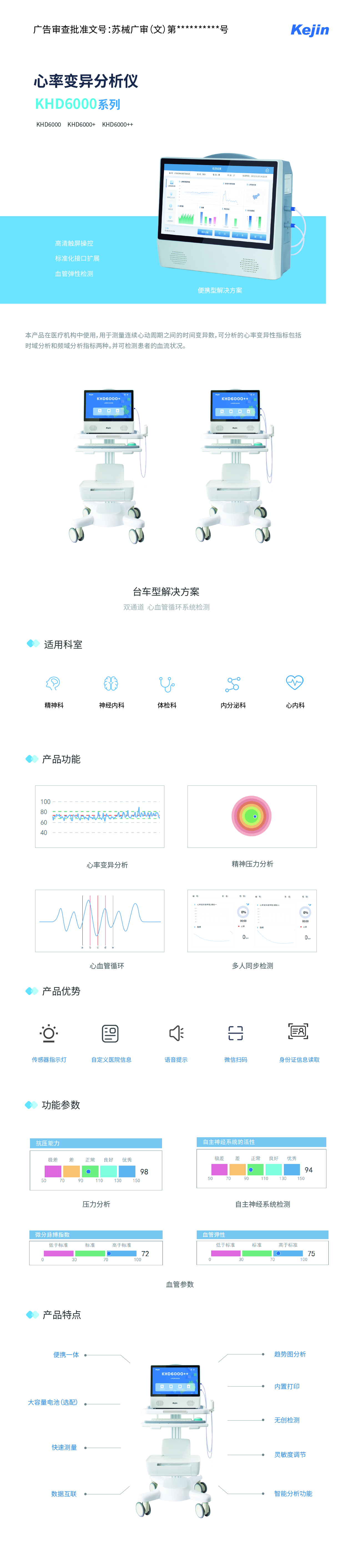 本产品在医疗机构中使用,用于测量连续心动周期之间的时间变异数,可分析的心率变异性指标包括时域分析和频域分析指标两种。并可检测患者的血流状况。